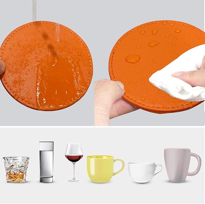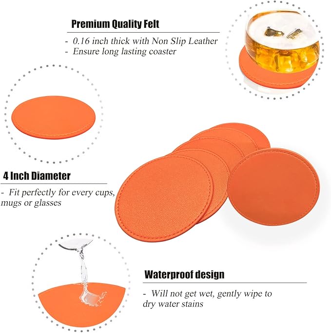 Coasters Set of 6 Soft Leather Drink Coaster Round Coaster with Sewing Around, Suitable for Various Cups, Wooden Tables,Home Decoration,4 Inches (Orange,Sewing Type)