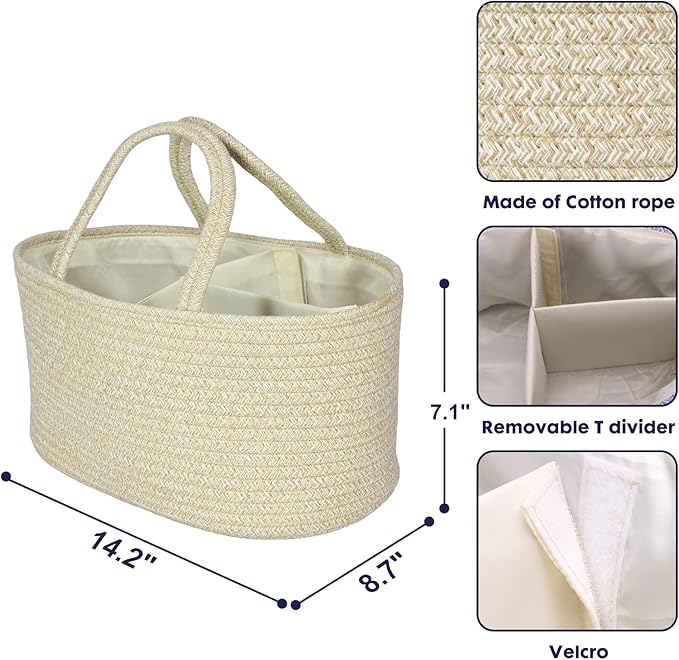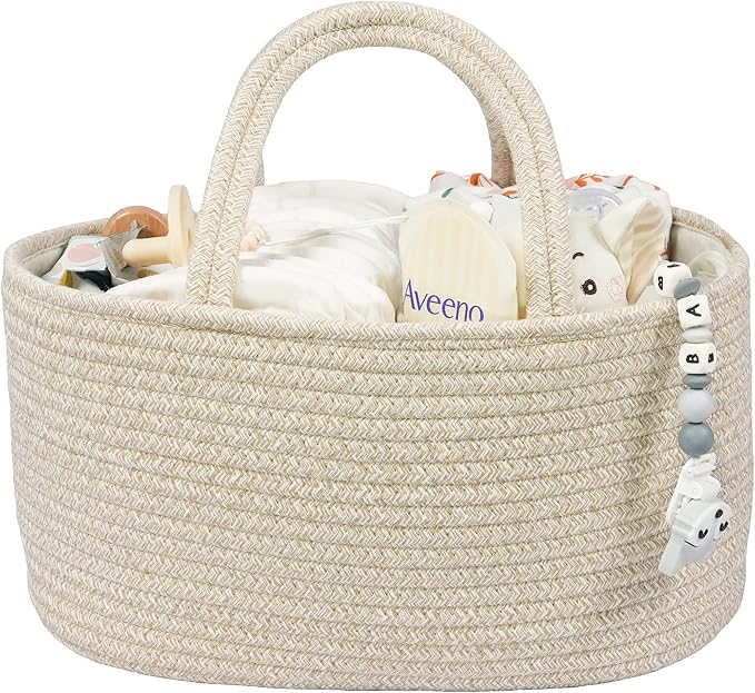 Baby Diaper Caddy Organizer for Girl Boy Cotton Rope Nursery Storage Bin Basket Portable Holder Tote Bag for Changing Table Car Travel Baby Shower Gifts Newborn Registry Must Have Items oatmeal