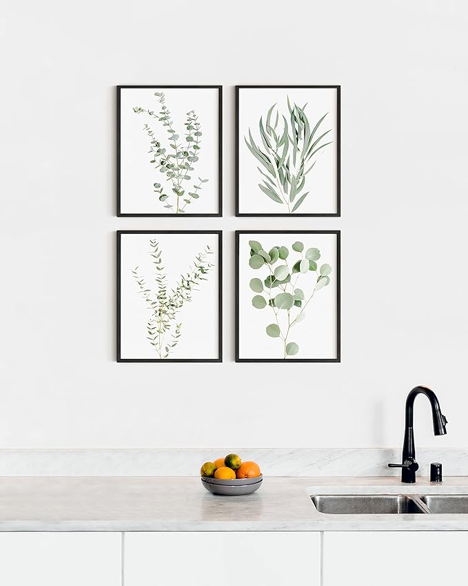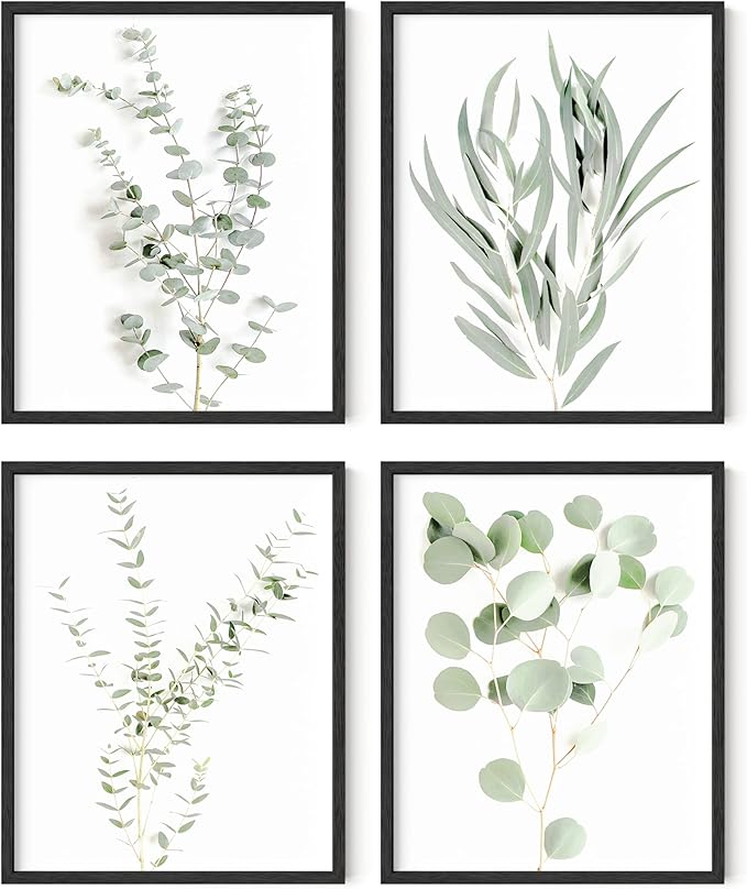 - PREMIUM WALL ART: To achieve the craftsmanship we’re known for, we use a printing technique on 8.5pt coated poster paper. The paper used for our plant wall art with frame is sustainably sourced, and our inks are water-based. This flower leaves wall art is equipped with plexiglass covered by protective film and two metal hangers for horizontal or vertical hanging. The Eucalyptus wall decor is shipped in a durable box for protection in transit.