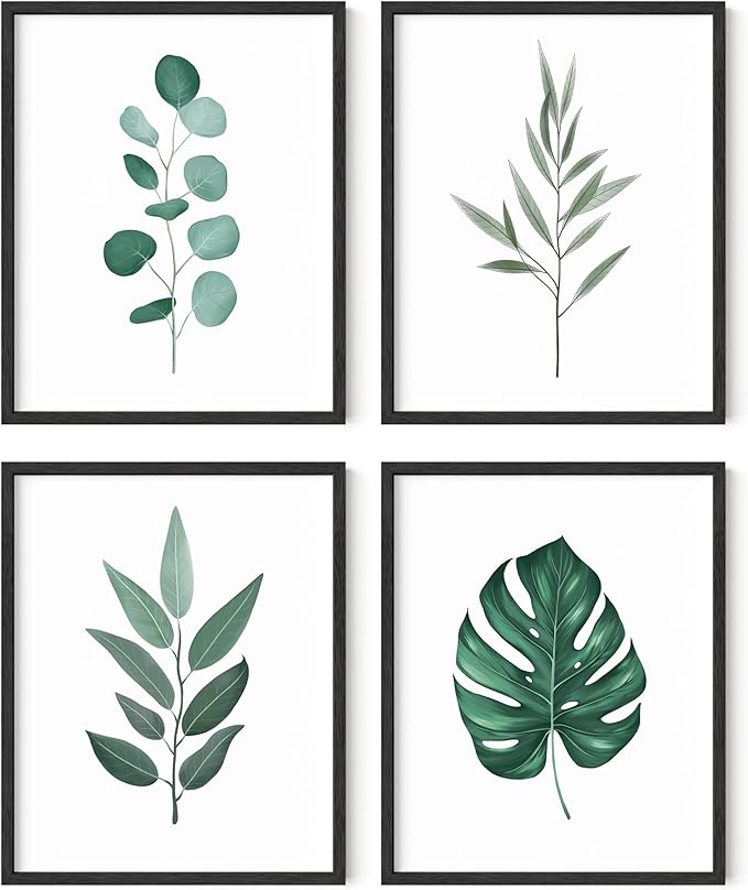 - GREEN LEAF WALL ART: The versatile design of the set of 4 wall art effortlessly complements various interior styles. Whether your home leans modern or traditional, this leaves wall decor will bring warmth to any bare wall. This frameable tropical print allows you to customize your art to suit your style and space.