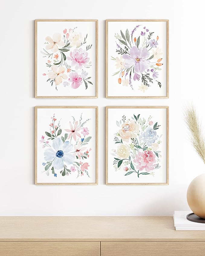 - FLORAL POSTER: Our floral art prints are beautiful, feminine, and breathtaking. The flower wall art adds a perfect touch to your office, bedroom, living room, kitchen, and/or bathroom. The floral wall decor features gorgeous flower arrangements, colorful petals, and small leaves. Framed or hung with clips, you’ll be happy with our exquisite flower pictures for bedroom and floral wall art.