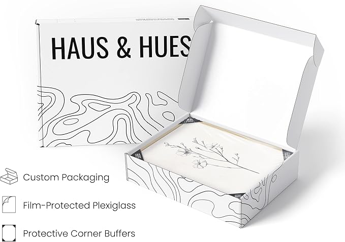 - PREMIUM WALL ART: To achieve the craftsmanship we’re known for, we use a printing technique on 8.5pt coated poster paper. The paper used for our botanical artwork is sustainably sourced, and our inks are water-based. The black floral print is equipped with plexiglass covered by protective film and two metal hangers for horizontal or vertical hanging. The farmhouse decor is shipped in a durable box for protection in transit.