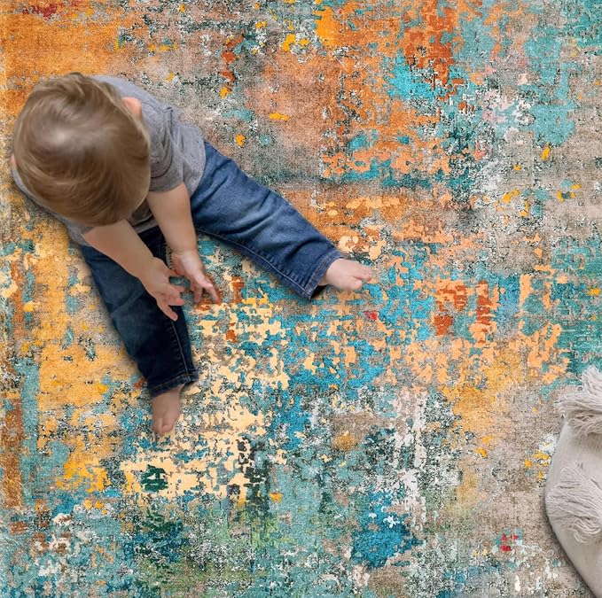 - [Modern Abstract Area Rug] - Add a pop of color for you home with this area rug. Designed with delicate palette, this collection impresses with an abstract print with splashes of blue, orange, yellow, and gray hues. It looks like a sunset, gives people a relaxing feeling, suitable for modern industrial and contemporary homes.