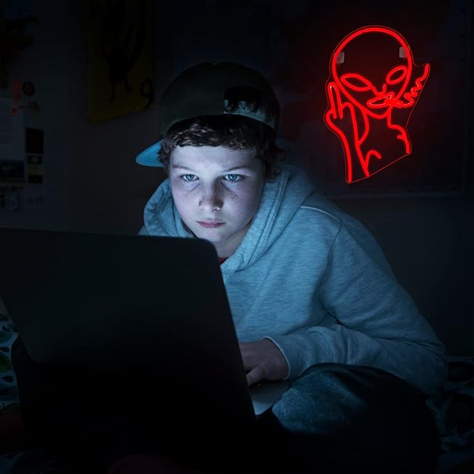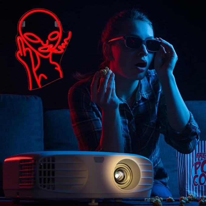 - 👽 Alien Bedroom Decor: Are you looking to add a little brightness and interesting thing to your room or office, the alien neon sign can deliver just the right amount of luminosity and add fun atmosphere.