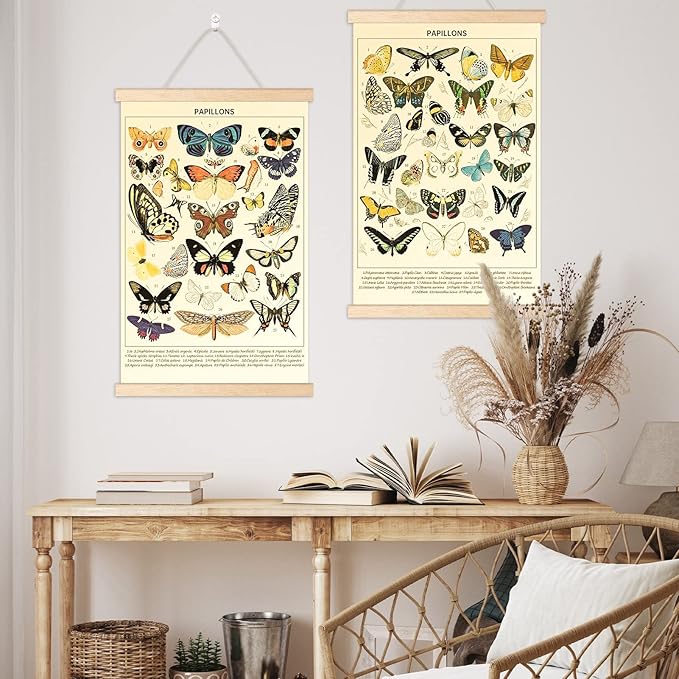 - Artful Set: Get 2 vintage butterfly art paintings with wooden frames and hanging ropes. Butterfly posters feature prints of different butterflies in various shapes, with name notes underneath, ideal for enhancing rustic vintage living rooms and spaces