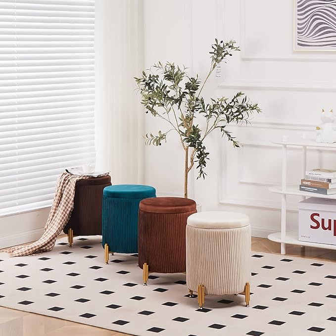 Mxfurhawa Round Ottoman Foot Stool with Storage and Metal Legs for Living Room Bedroom, Velvet Upholstered Footrest Stool Support 300lbs Modern Padded Seat Ottoman Coffee Table (Teal)