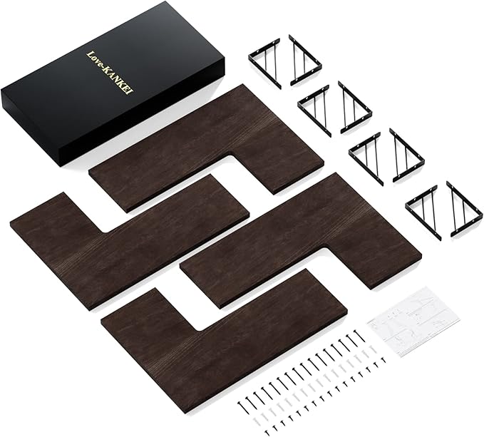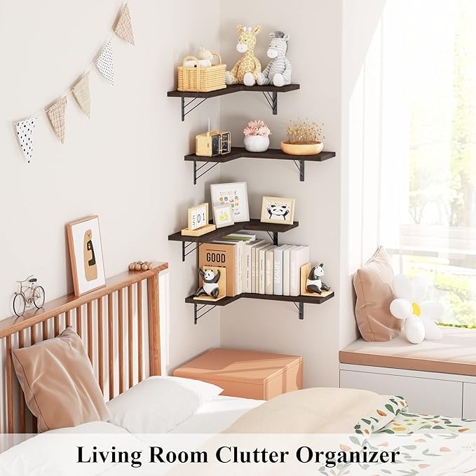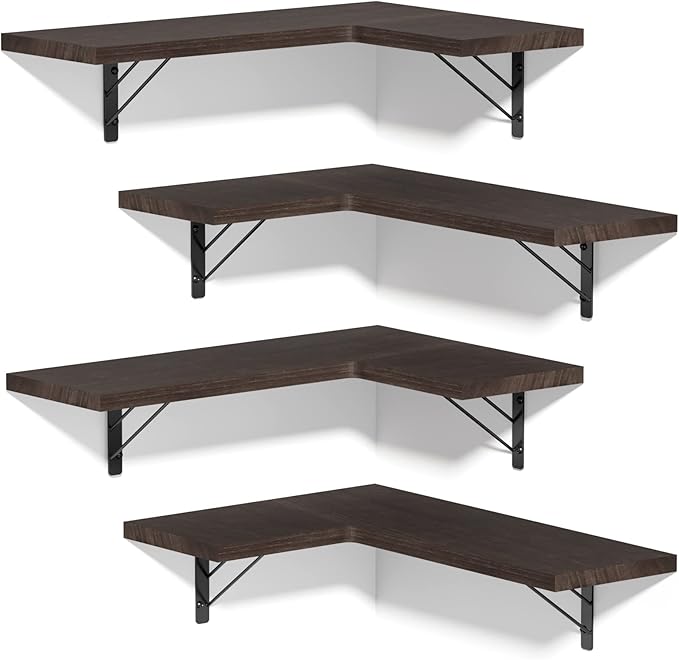 Love-KANKEI Corner Shelf Wall Mounted,Floating Wall Shelves for Storage,Rustic Wood Hanging Shelves for Display,Bedroom Bathroom Living Room Kitchen,Set of 4, Dark Brown