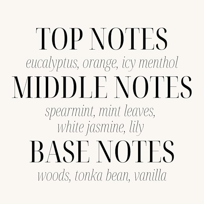 - Top notes: fresh mint leaves, citrus and orange zest, Middle notes: eucalyptus, spearmint, peppermint and herbs, Base notes: woody, camphor and fir needles