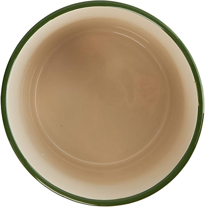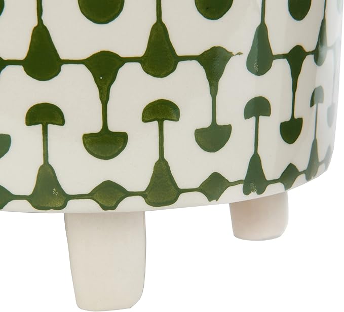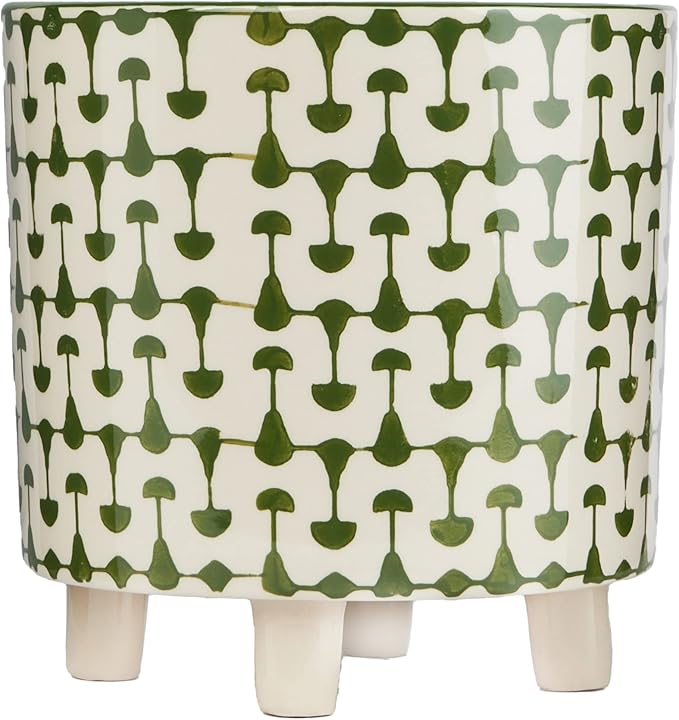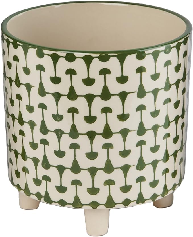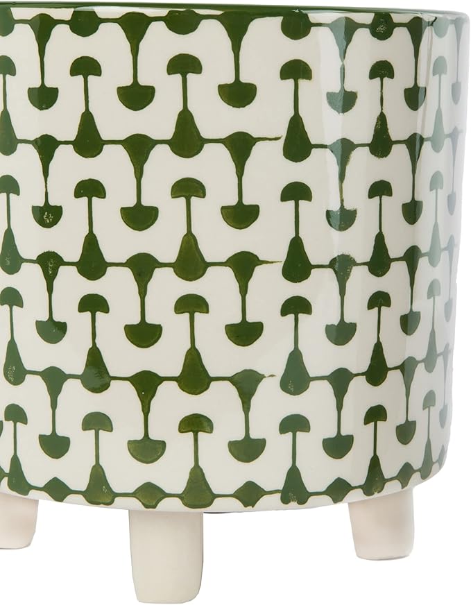 - Green and white stoneware planter with geometric pattern and 4 feet