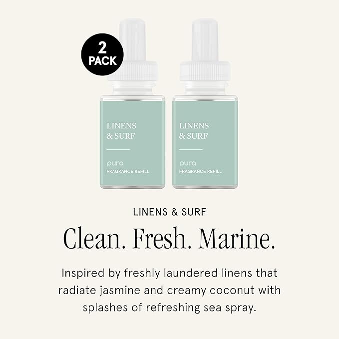 Pura Smart Home Air Diffuser Fragrance - Smart Home Scent Refill - Up to 120-Hours of Premium Fragrance per Refill - Clean Diffuser for Office & Apartment - 2 Pack, Linens & Surf