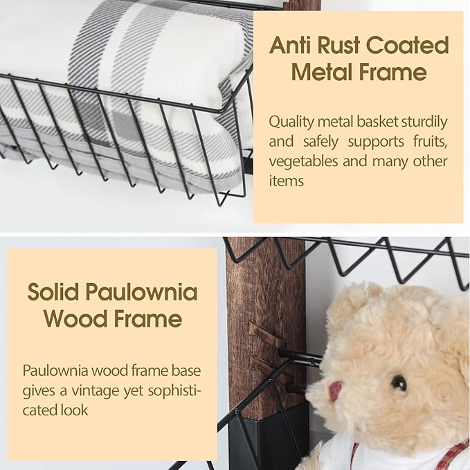 - [UNIQUE DESIGN]- Built to last with strong wood frame with anti rust coated durable 3 metal wire basket adds some vintage rustic vibe to your home interior. Complements any interior design, making an excellent addition for kitchen, bedroom, bathroom, laundry room, office and playroom