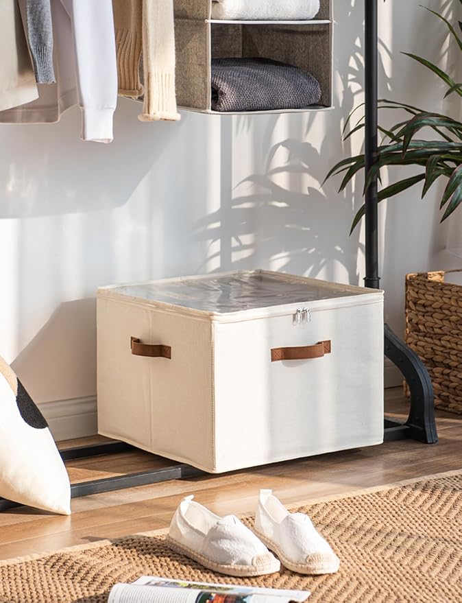 StorageWorks Shoe Organizer for Closet, Fits up to 16 Pairs, Shoe Cubby Storage Containers with Adjustable Dividers and Clear Cover, Beige