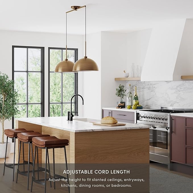 Nathan James Percy Modern 2-Light Pendant Island Light Fixture, Brass Hanging Lights with Gold Metal Shade and Adjustable Cord, for Kitchen, Living Room, Vintage Brass, Set of 2