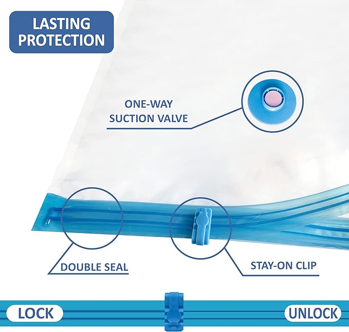 - Reliable protection: With the triple-seal turbo valve & double-zip seal design, our vacuum bags get the air out in the suction process. Can be used repeatedly.