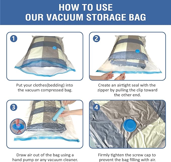 - Hand Pump Included for Easy Use: Works with standard vacuum cleaner. Simply put the items in our storage vacuum bag, seal the zipper, suck out the air, close the lid. You can also use the pump included to easily vacuum storage your items.