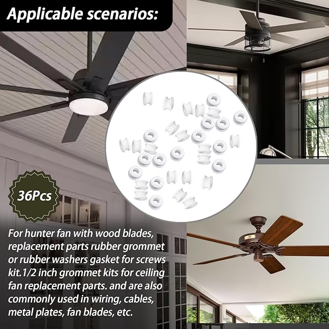 - √【Applicable scenarios】:For hunter fan with wood blades, replacement parts rubber grommet or rubber washers gasket for screws kit.1/2 inch grommet kits for ceiling fan replacement parts. and are also commonly used in wiring, cables, metal plates, fan blades, etc.