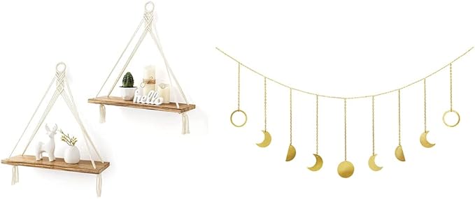 Mkono Macrame Hanging Shelves and Moon Phase Wall Hanging Boho Wall Decor for Bedroom Bathroom Living Room Nursery Dorm Room, Set of 3