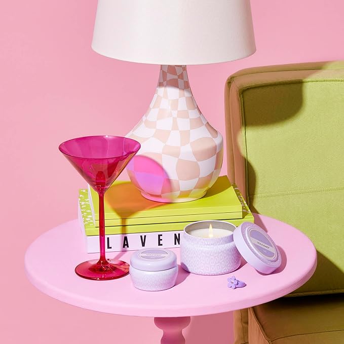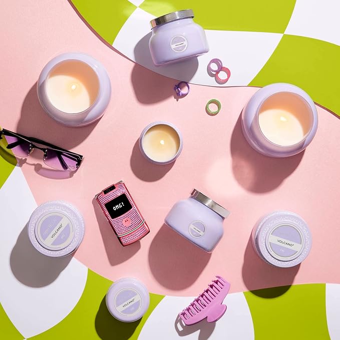 - Capri Blue Lavender Colored Mini Tin Jar Candle (3 oz) - A little drama, a little nostalgic and a whole lotta cuteness! These mini jar candles are the perfect size to take your fav fragrance, Volcano, on the go. Burn Time: Up to 15 hours.