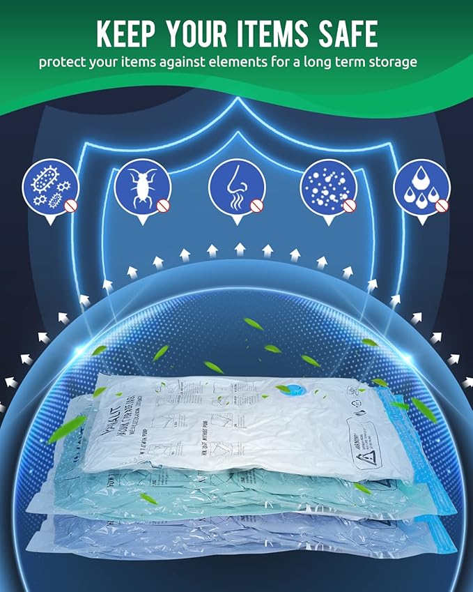 - 【Reduce Bag's Volume by 80%】Our vacuum storage bags are designed to help neatly organize your closet and store clothes, after using it, you can fell that your bedroom or apartment become a clutter-free and bigger zone, and able to pack more luggage into your suitcase when you travel, and use the thick and heavy duty polyester material, which can ensure you to use again and again and store the clothes for a long time