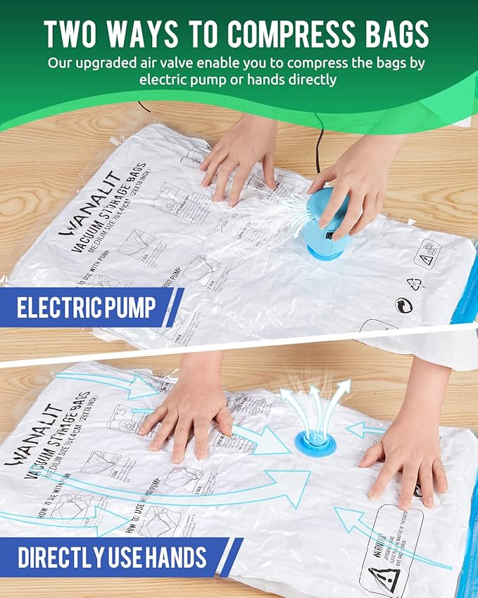 - 【Upgraded 2 Ways to Compress】Our vacuum storage bags are upgraded on the air valve which is not only cap-free design, also allows you draw the air out of the bags with 2 ways.Firstly you can use the your vacuum bags pump or vacuum cleaner to take the air air out of the bags, which is powerful and very fast. Secondly, you can directly use your hands to press the bags to make the air out of the bags