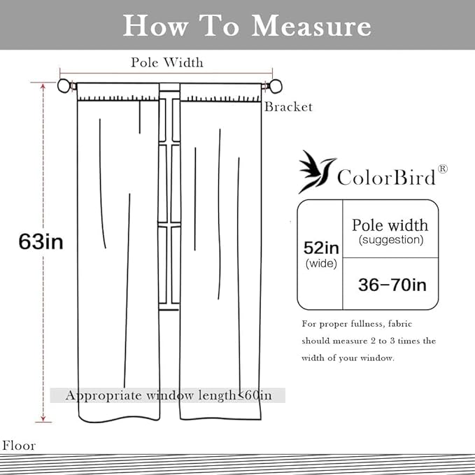 - Size & Header Type - 2 panels per package, each blue boho curtains measure 52" wide x 63" length. Rod pocket curtains have a sewn-in pocket that slides easily onto your curtain rod for quick installation