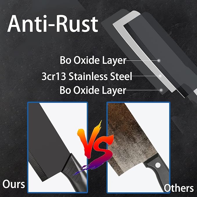 - Superior high carbon stainless steel blade are applied with black BO Oxide technology, The food-grade coating on the blade enhances durability and rust resistance. Sturdy and durable.