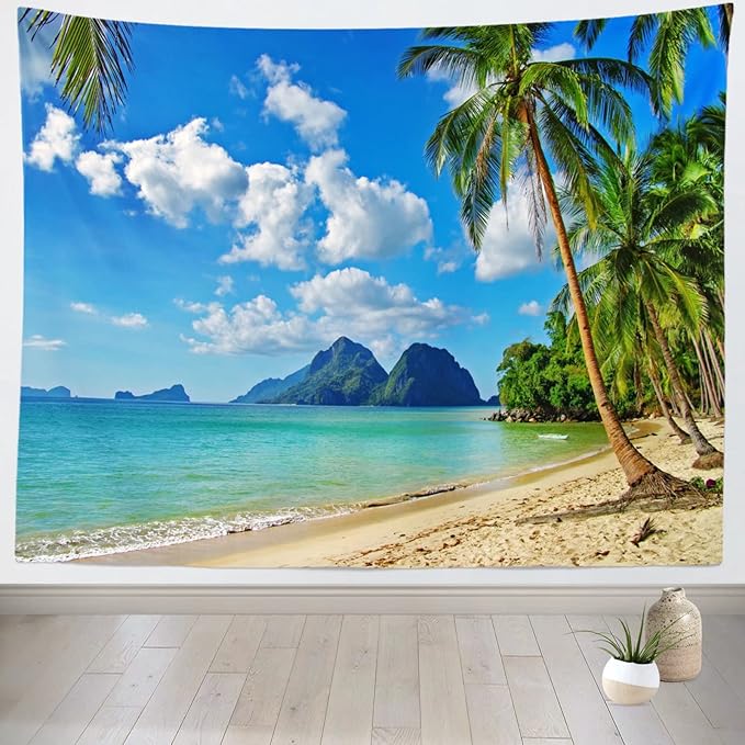Loccor Ocean Beach Tapestry Tropical Island Palm Tree Waves Extra Large Summer Hawaii Paradise Landscape Wall Hanging Hippie Bohemian Art for Living Room Bedroom Home Decor, 140'' x 98''