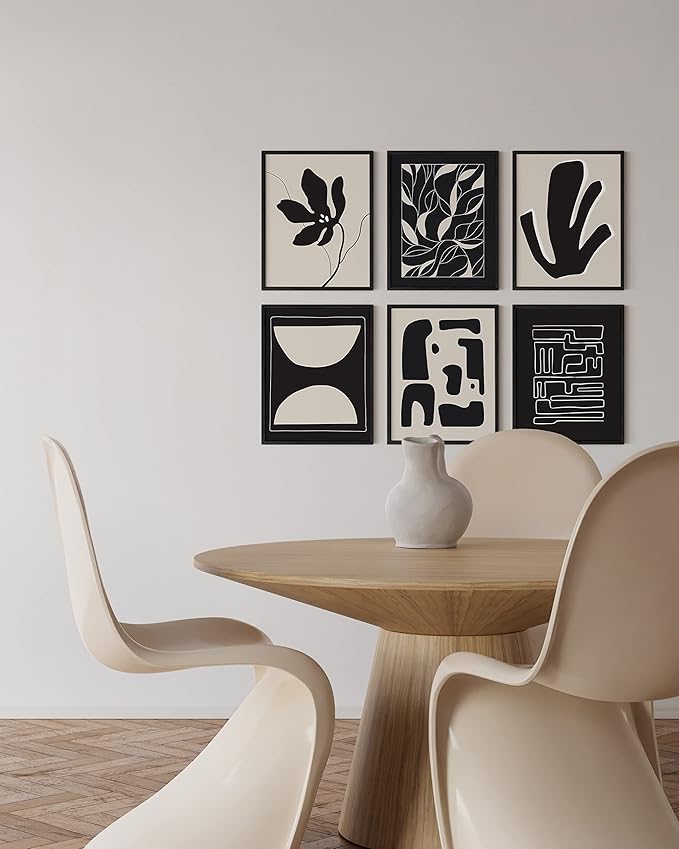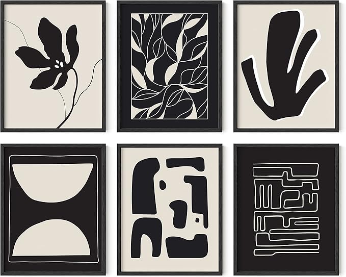 - BLACK WALL ART AND BEIGE WALL COLLAGE: The versatile design of the mid century gallery wall art effortlessly complements various interior styles. Whether your home leans modern or traditional, this black abstract wall art will bring warmth to any bare wall. This frameable geometric wall art set allows you to customize your art to suit your style and space.