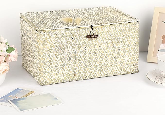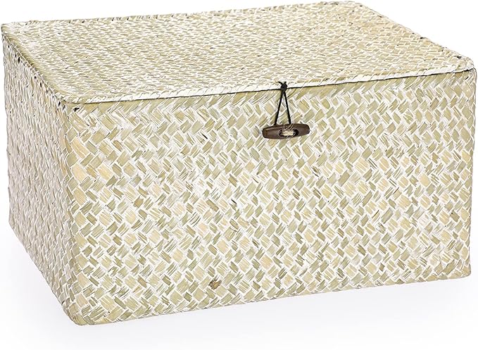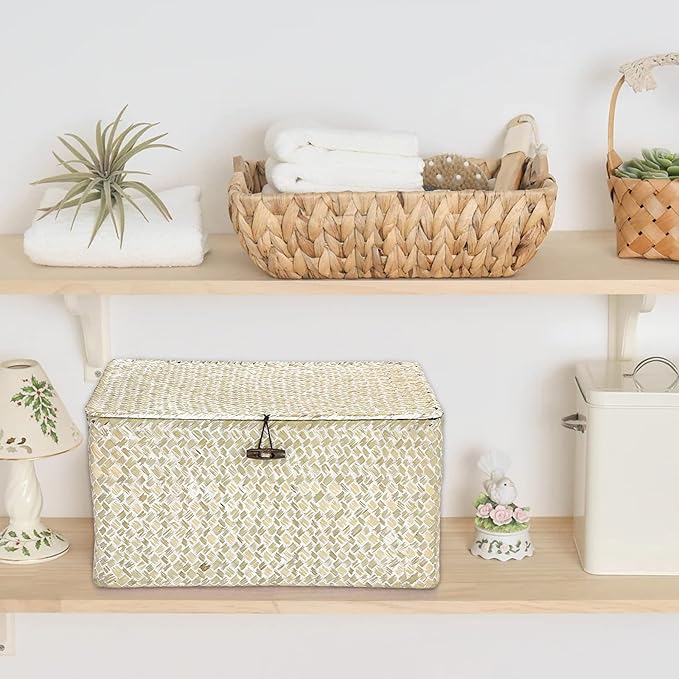 Hipiwe Wicker Shelf Baskets Bin with Lid, Large Natural Seagrass Basket Storage Bins Handwoven Rectangular Household Basket Boxes for Shelf Wardrobe Home Organizer and Decor, Whitewash