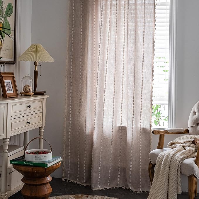 Sutuo Home Boho Curtain for Bedroom 84 Inch Length, Light Filtering Farmhouse Vintage Shabby Chic Tassels Window Treatment Bohemian Embroidery Drape, Rod Pocket 1 Panel 52" W x 84" L, Taupe