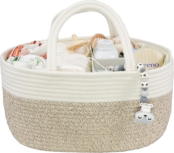 Large Baby Diaper Caddy Organizer for Girl Boy Rope Nursery Storage Bin Basket Portable Holder Tote Bag for Changing Table Car Travel Baby Shower Gifts Newborn Registry Must Haves White and Brown