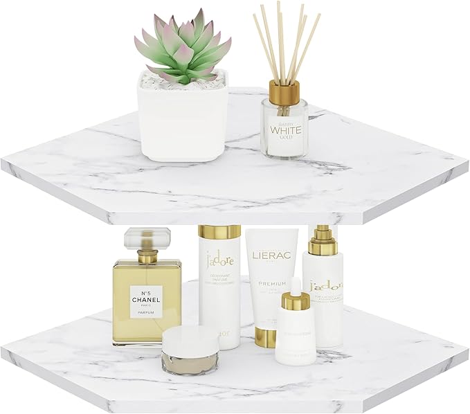 Homode Corner Wall Shelf, Set of 2 Floating Corner Shelves with Wire Hole, 2 Tier Wooden Hanging Display Shelf for Bathroom Bedroom Kitchen, White Marble