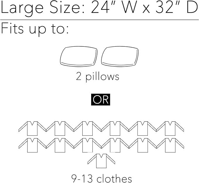 - 3 Large bags: Each bag measuring 24” W x 32” D (60cm W x 80cm D), that’s big enough for 2 standard pillows or 9-13 clothes