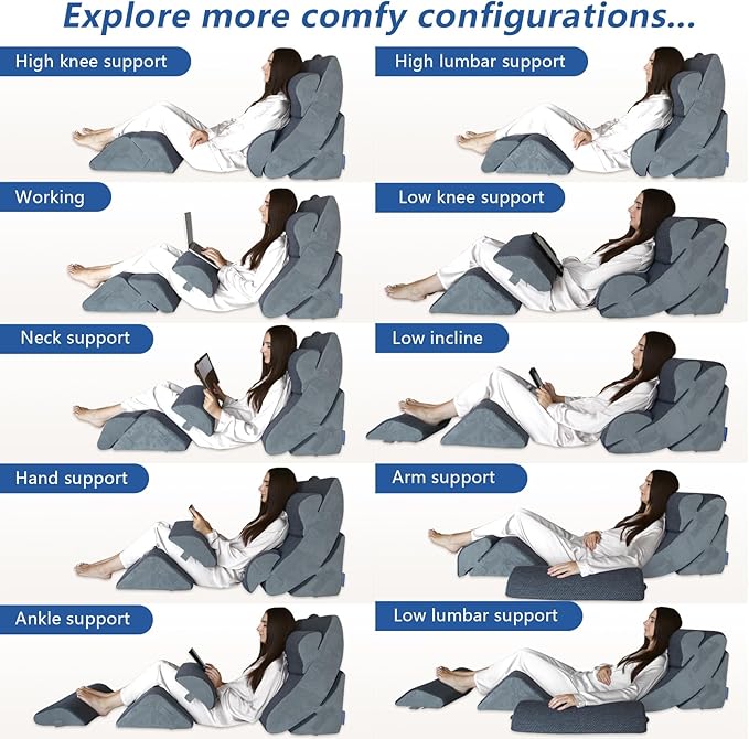 - 【Soft & Supportive Gel Memory Foam】The back pillow, lumbar pillow and the head pillow of the wedge pillow set are made of soft memory foam with gel particles, which ensures comfortable and refreshed even with prolonged use. The base pillow, leg pillow and knee pillow are made of high-density foam, which provides sufficient support and will not deform after long-term use.