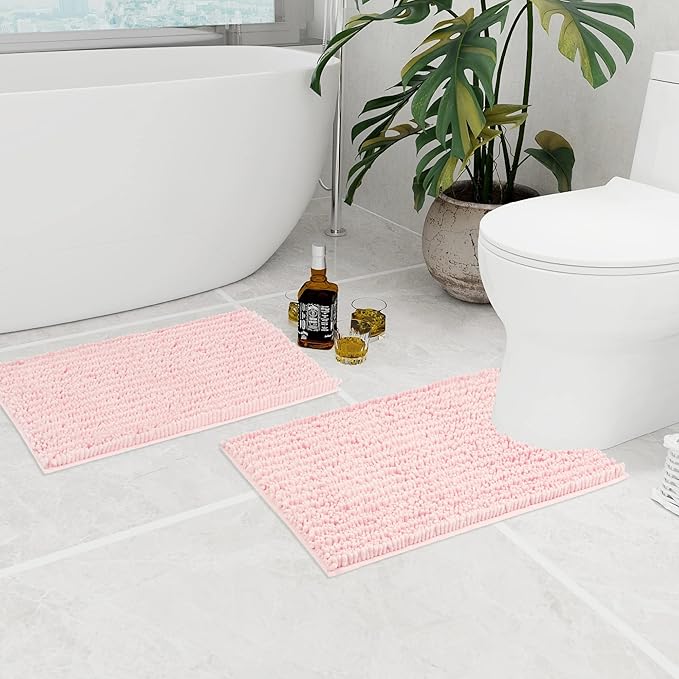 Walensee Bathroom Rug 2 Pieces Set Non Slip Bath Mat (20"x32" Plus 20"x24" U Blush) Water Absorbent Super Soft Shaggy Chenille Machine Washable Dry Extra Thick Perfect Carpet for Shower Floor