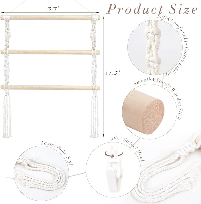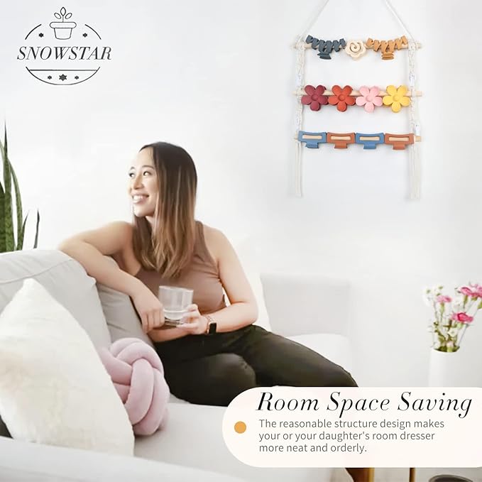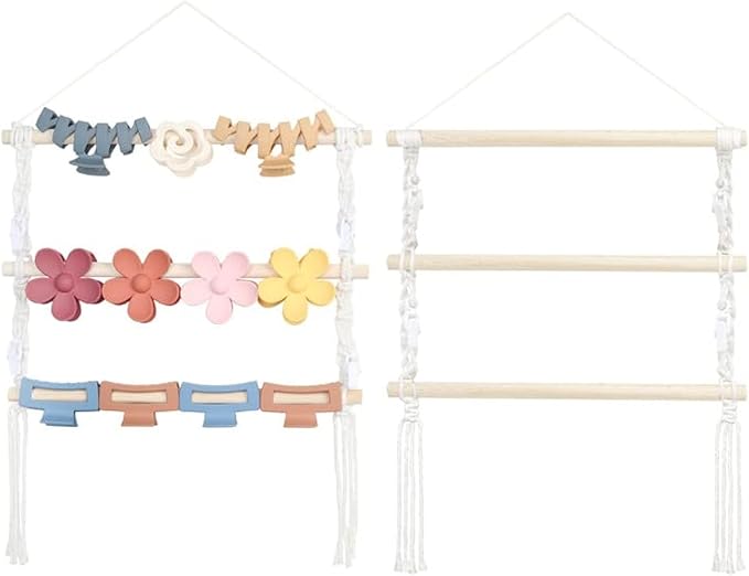 - Premium Materials:Our claw clips organizer is made of cotton ribbons and wooden sticks. Soft and comfortable cotton ribbons with very good weight-bearing. Wooden sticks are beech wood, sturdy and not easily cracked and deformed.Easily view and protect different hair clips and claw clips, durable and not deformed, has a long lifetime, saving space.
