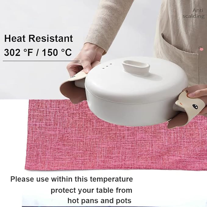 - Double Layered Fabric - Each placemat has double layers and both sides are usable. Its thickness is appropriate for protecting the table form hot plates,stain,scratches and some water droplets spilled from tableware.NOT waterproof