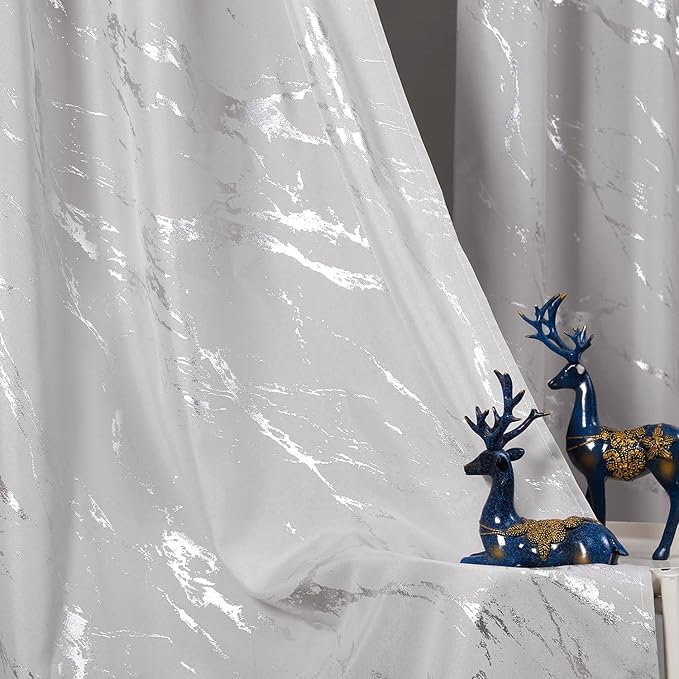 Taisier Home Silver Foil Print Linen Textured Curtains Geometric Marble Pattern Design Curtains for Living Room Light Filtering Window Treatment 2 Panels 84" L,Beige and Silver Print