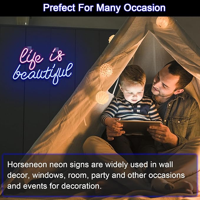 - Safe & High quality: Life is beautiful neon Sign is made from tough acrylic and flexible Led neon strip, that it won't break easily if it's knocked, dropped or bumped into.The light also has high light transmission rate and no danger of heating.
