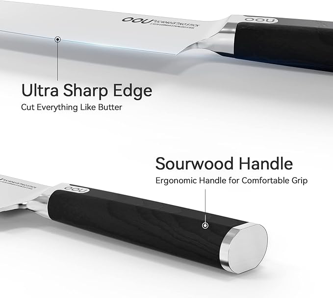 - 【HIGH TECH IN KITCHEN KNIVES】Patented BO Oxidation Surface suits an fantastic oxide layer on OOU knife for true anti-rusting. Ergonomic knife handle is made of black colored wood for comfort and durability. It features textured finger points that provide slip resistance and a better grip. The solid handle can minimize wrist tension while providing a secure, comfortable grip no matter the size of your hand or where you are gripping the handle.