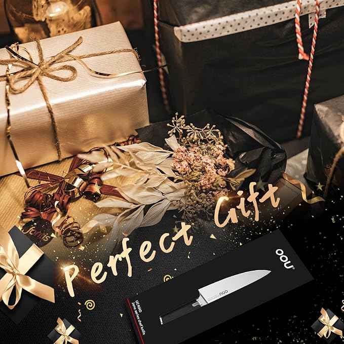 - 【PERFECT QUALITY CHEF KNIFE】OOU 8 inch pro chef's knife is made of premier high carbon German EN1.4116 High Carbon stainless steel with high strength and increased rigidity. Processed with the unique polishing technology, hand polished 12-15°blade angle, the kitchen knives blade tapers from the spine to the cutting edge, for effortless precision cutting, as well as greater stability and durability.