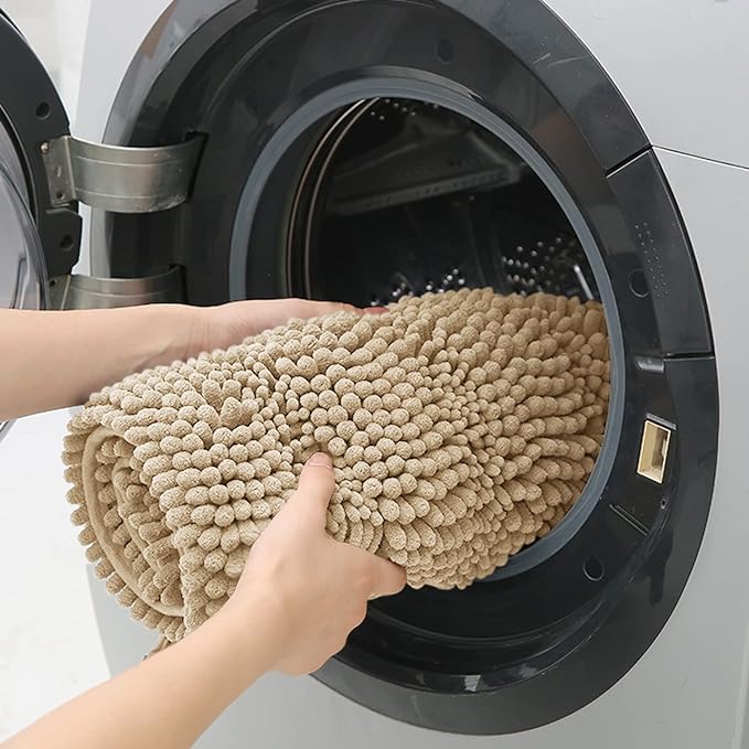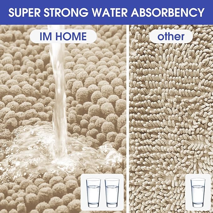 - SUPERIOR ABSORBENCY: The bold pile chenille on the top surface of the luxurious toilet mat soak up a lot of water and keep your floor dry when you're stepping out of the bath, Bathtub, shower, or getting ready by the sink, moisture is trapped in the bathroom rug’s deep pile, to avoid the dripping water disturbing your bathroom's serenity and tidy.