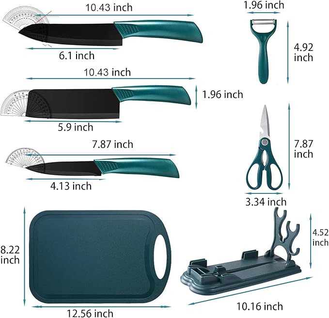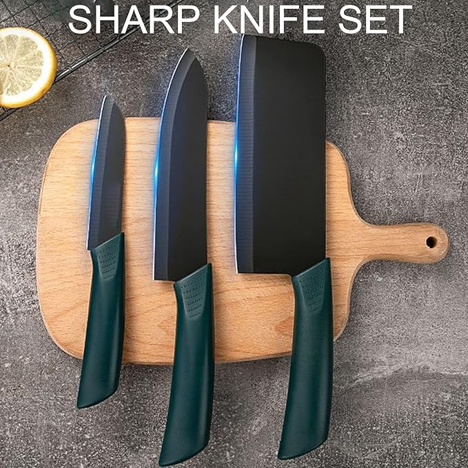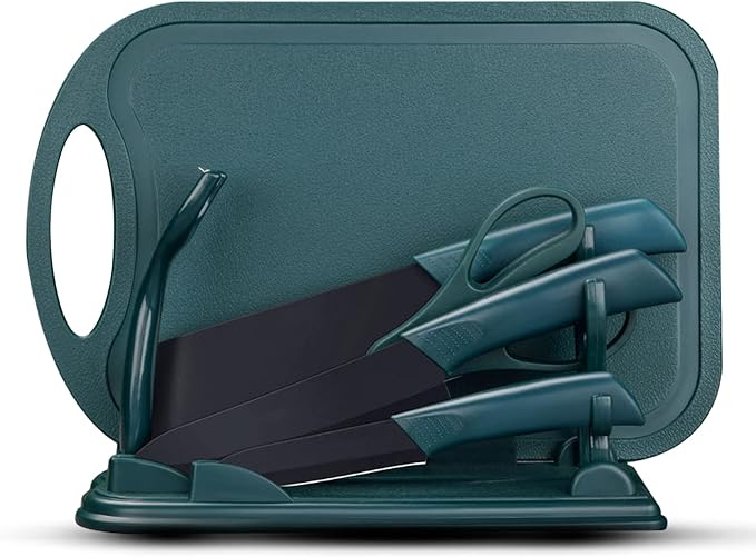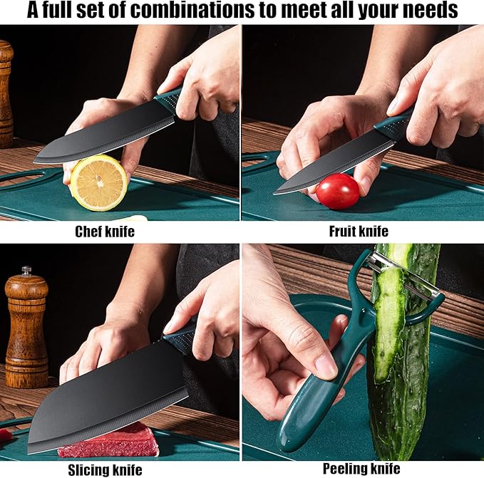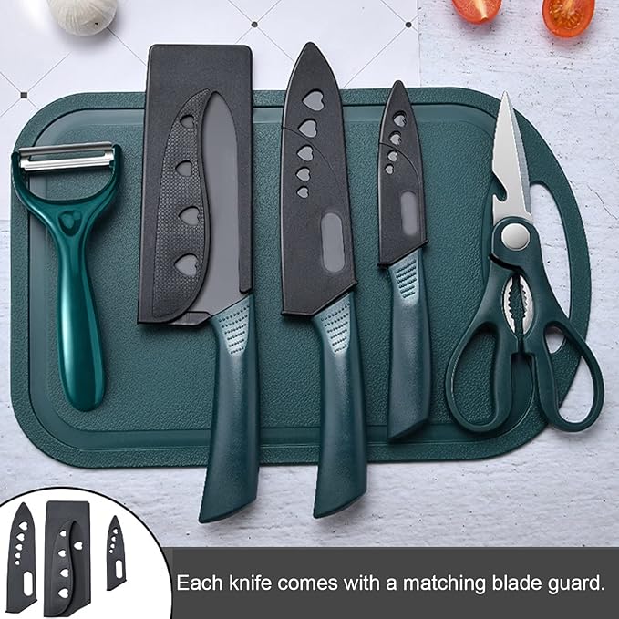 Magicorange 7-Piece Kitchen Knife Set - 5 Black Stainless Steel Knives with Sheaths, Cutting Board, and a Knife Block- Stainless Steel Kitchen Knives with PP Ergonomic Handle (Green)