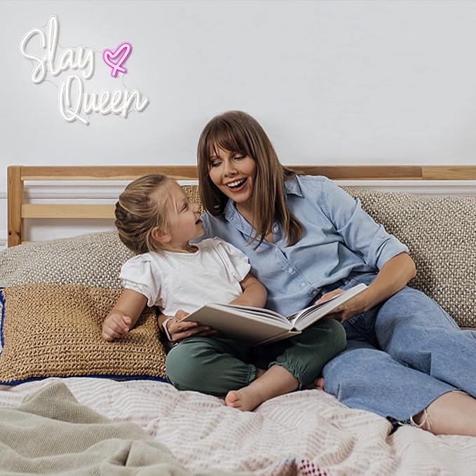 - ENERGY-SAVING: Slay queen neon sign(15.7" x 12.6"/40 x 32cm) with 59.1" cable can be connected to computer/charger/power bank. There is an ON/OFF switch on the USB connection cable, you can use the switch according to your needs for safety and energy saving.