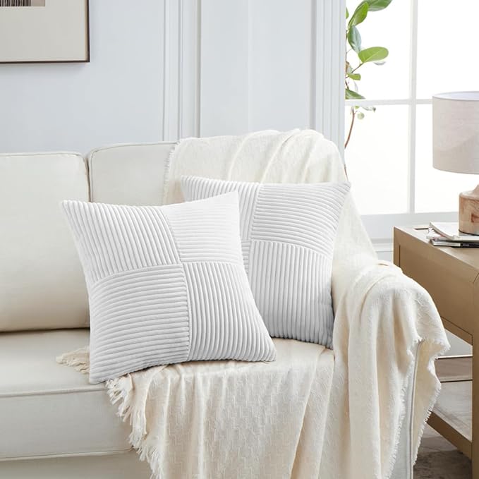 Fancy Homi 2 Packs Pure White Decorative Throw Pillow Covers 18x18 Inch for Living Room Couch Bed Sofa, Farmhouse Boho Home Decor, Soft Corss Corduroy Patchwork Textured Square Cushion Case 45x45 cm