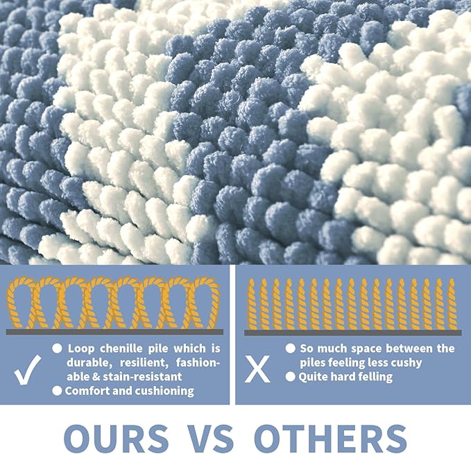 - 【Loop Chenille Pile】Our Chenille bathroom rugs featuring loop chenille pile which is durable, resilient and fashion-able. There are not so much space between the piles so your feet can feel comfort and cushioning. At the same time, it allows cabinet doors to easily open and close.