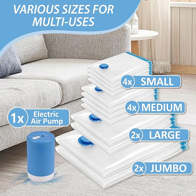 - 12 Combo includes: Our 12 pack space saver bags pack comes with 2 Jumbo: 39.35” X 27.5”(100cm X 70cm); 2 Large: 33.5” X 21.65”(85cm X 55cm); 4 Medium: 27.5”X 19.5”(70cm X 50cm); 4 Small: 23.5”X 15.7” (60cm X 40cm) and 1 electric air pump.