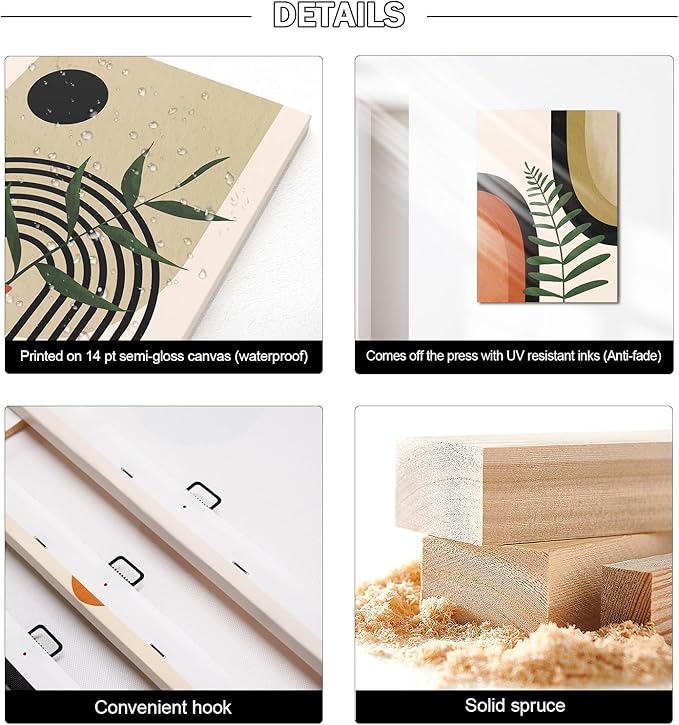 - 【Boho Wall Decor Canvas Art Prints】This minimalist neutral geometric black green botanical canvas wall decor, modern wall decor prints, printed on 14pt semi-gloss canvas (waterproof), printed with UV resistant ink (fade resistant) gallery quality giclée printing for a vibrant piece, wrapped in a wood frame that will last, tightly stretched to ensure the canvas won't crease and bend