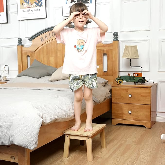 - SATETY: Arc treatments are made around the small stool to prevent your children from bumping into it. This small stool features an oval slat at the top for easy carrying. Step stools for adults shouldn't be bulky or cumbersome. Easily carry this bed stool from room to room.