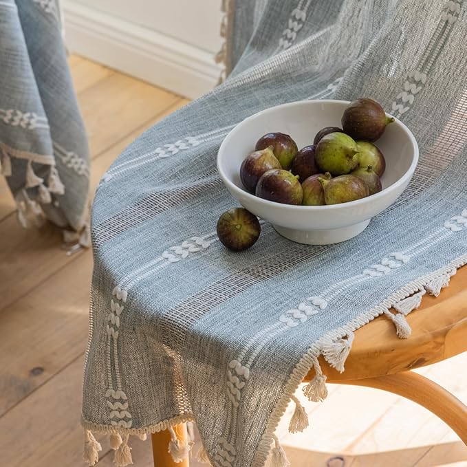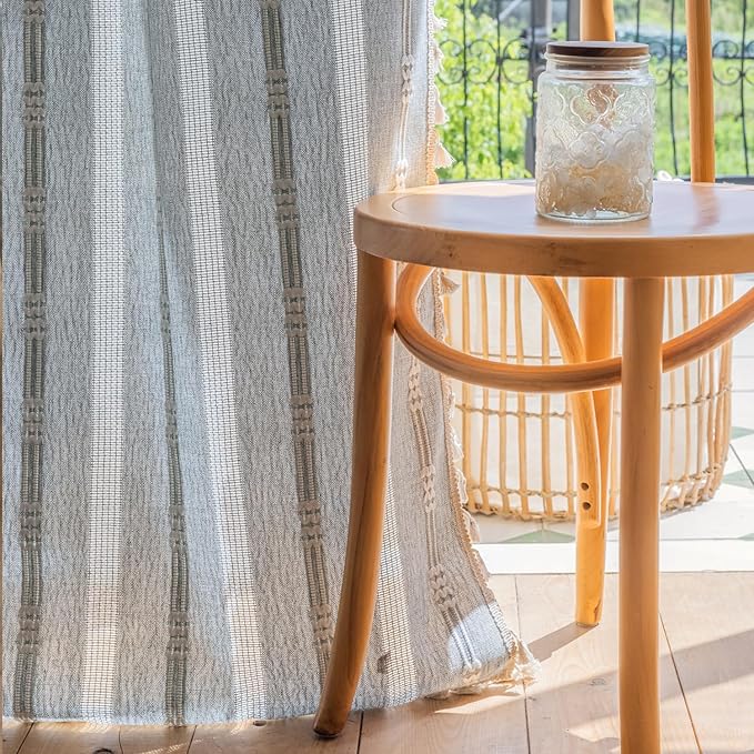 - Farmhouse Curtains - Decorative embroidered stripes add boho and farmhouse vibes. Neutral hues and a big window pane design give them a classic look that will fit nicely into your living room, kitchen, dining room, hallway door, camper, bedroom, nursery and etc.